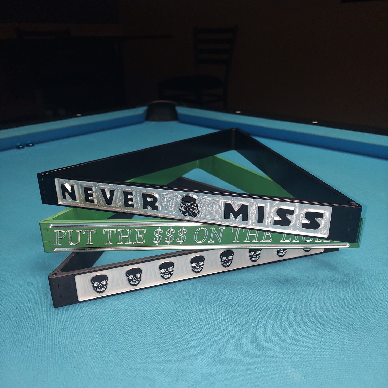 Our aluminum pool racks are approximately 1/4" thick and 12" front to back. These dimensions make them ideal for minimizing rack interference when playing straight pool (14.1). All stylized racks are powder coated for durability before final machining. Also available in plain powder coat finish without one of our deigns.